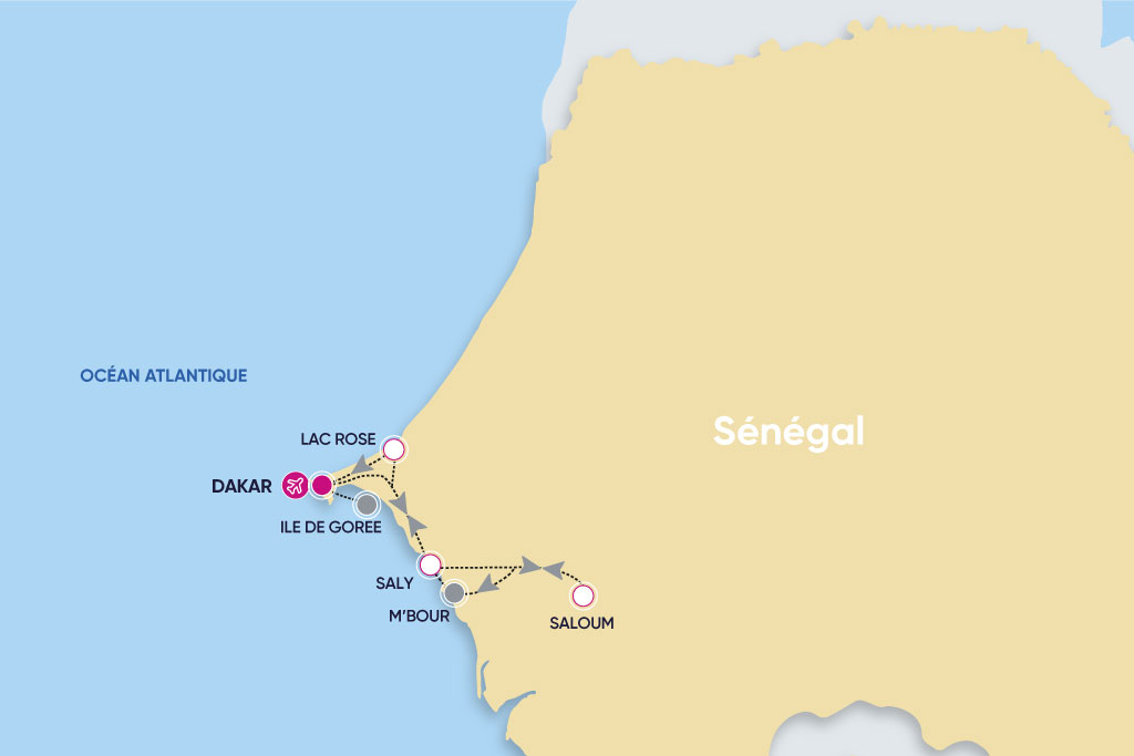- Jour 8, mercredi ou samedi : Lac Rose / Gorée / Dakar / France