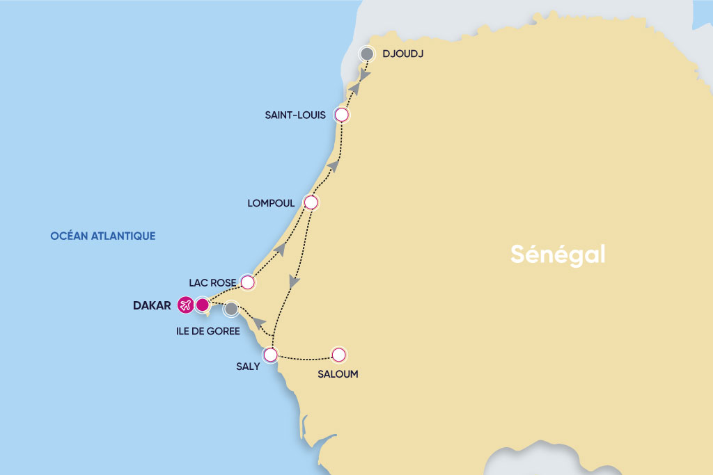 - Jour 1, mercredi ou samedi : France / Dakar / Lac Rose