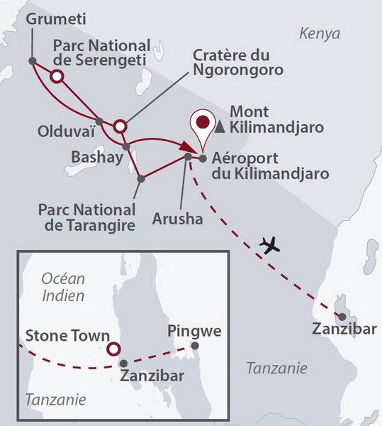- Survol en ballon du Serengeti (jour 6) : opère toute l’année (selon météo), sous réserve d’un minimum de 4 participants ; pick-up vers 5h du matin à votre lodge par le prestataire et transfert au site de décollage pour un vol en regroupé d’environ 1h/1h15 (nacelle de 12 places) ; après l’atterrissage, un copieux petit-déjeuner de brousse vous sera servi et votre chauffeur-guide viendra vous récupérer avec le reste du groupe pour poursuivre votre safari ; billets non remboursables (sauf en cas d’annulation par le prestataire) ; réservation à l’avance obligatoire et soumise à confirmation : nous consulter.
