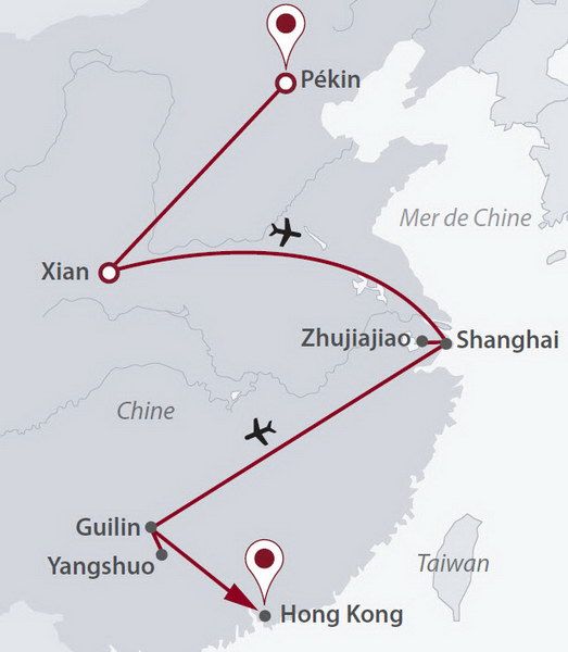- Le rythme modéré avec des étapes de 3 nuits à Pékin, 2 nuits à Xian, Shanghai et Yangshuo, et 4 nuits à Hong Kong