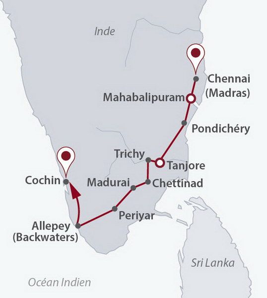 - Les excursions et visites mentionnées avec guide accompagnateur local parlant français de Chennai (Madras) à Cochin.