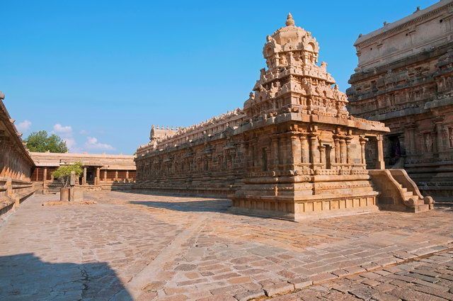 Route à travers des paysages de rizières et des villages spécialisés dans la fabrication de cordes en fibres de noix de coco pour rejoindre Gangaikondacholapuram. Visite de cet imposant sanctuaire shivaïte inscrit à l’UNESCO. Déjeuner, puis découverte du temple de Darasuram (UNESCO), élevé au 12e s. par les souverains Chola et dédié lui aussi à Shiva. Arrivée à Tanjore en fin de journée. (P.déj+Déj+Dîn)