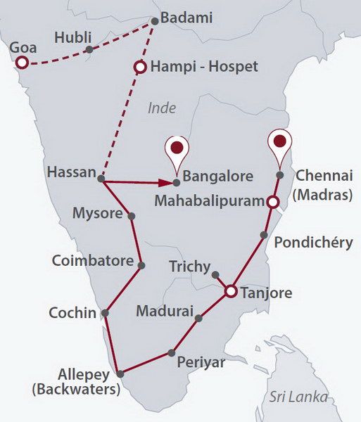 - Les excursions et visites mentionnées avec guide accompagnateur local parlant français de Chennai (Madras) à Goa.