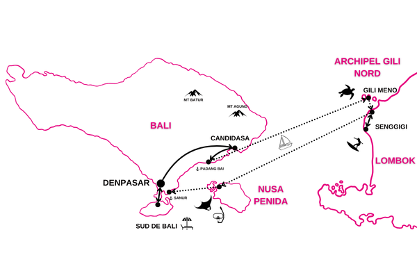 * La première et/ou la dernière nuit de séjour plage sur l'une des îles à proximité de Bali (Nusa Lembongan, Nusa Penida, Gili, Lombok, etc.) pourra s'effectuer à Bali au lieu de l'île prévue en raison d'horaires de vols ne permettant pas pas d'effectuer votre transfert par bateau vers l'île ou l'aéroport le jour même de votre vol.