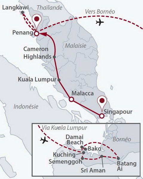 12 jours / 9 nuits Selon programme De Singapour à Penang en passant par Malacca la coloniale, Kuala la métissée et les plantations de thé de Cameron Highlands, la Malaisie est un formidable concentré d’Asie ! C’est parti pour une escapade à Singapour et un voyage dans un pays-patchwork aux charmes insoupçonnés.-