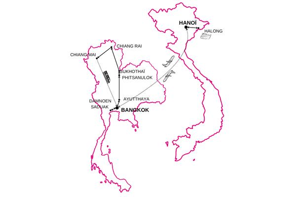 Découvrez la capitale Bangkok, ses temples bouddhistes, ses marchés flottants et ses quartiers bouillonnants et les trésors naturels de Chiang Mai, en passant par les sites historiques d’Ayutthaya et de Sukhothaï, les majestueux temples de Chiang Rai, et rencontrez les tribus des montagnes dans la célèbre région du Triangle d’Or. Terminez votre voyage au Vietnam, à la découverte d'Hanoï et la mythique Baie d'Halong !-