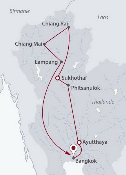 Bangkok la trépidante, entre gratte-ciel et temples étincelants, Chiang Mai la Rose du Nord au charme nostalgique, les anciennes capitales royales de Sukhothaï, Ayutthaya et Phitsanulok, ainsi que le mythique Triangle d’Or.