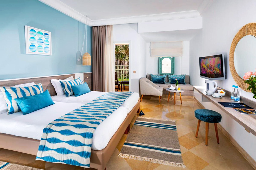 La Chambre Swim Up dispose des mêmes équipements que la Chambre Standard vue Jardin / vue Mer avec une terrasse offrant un accès direct à la piscine.