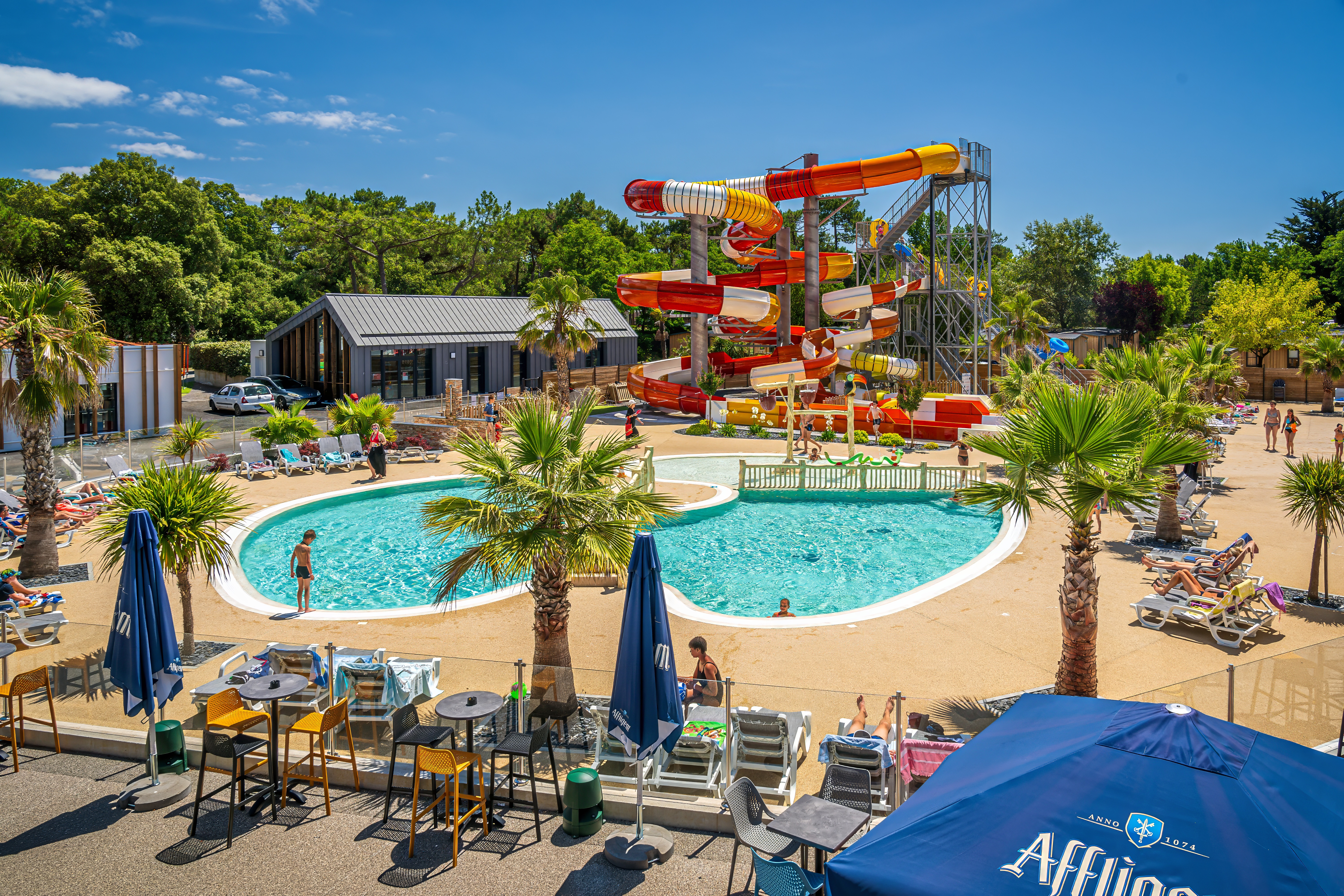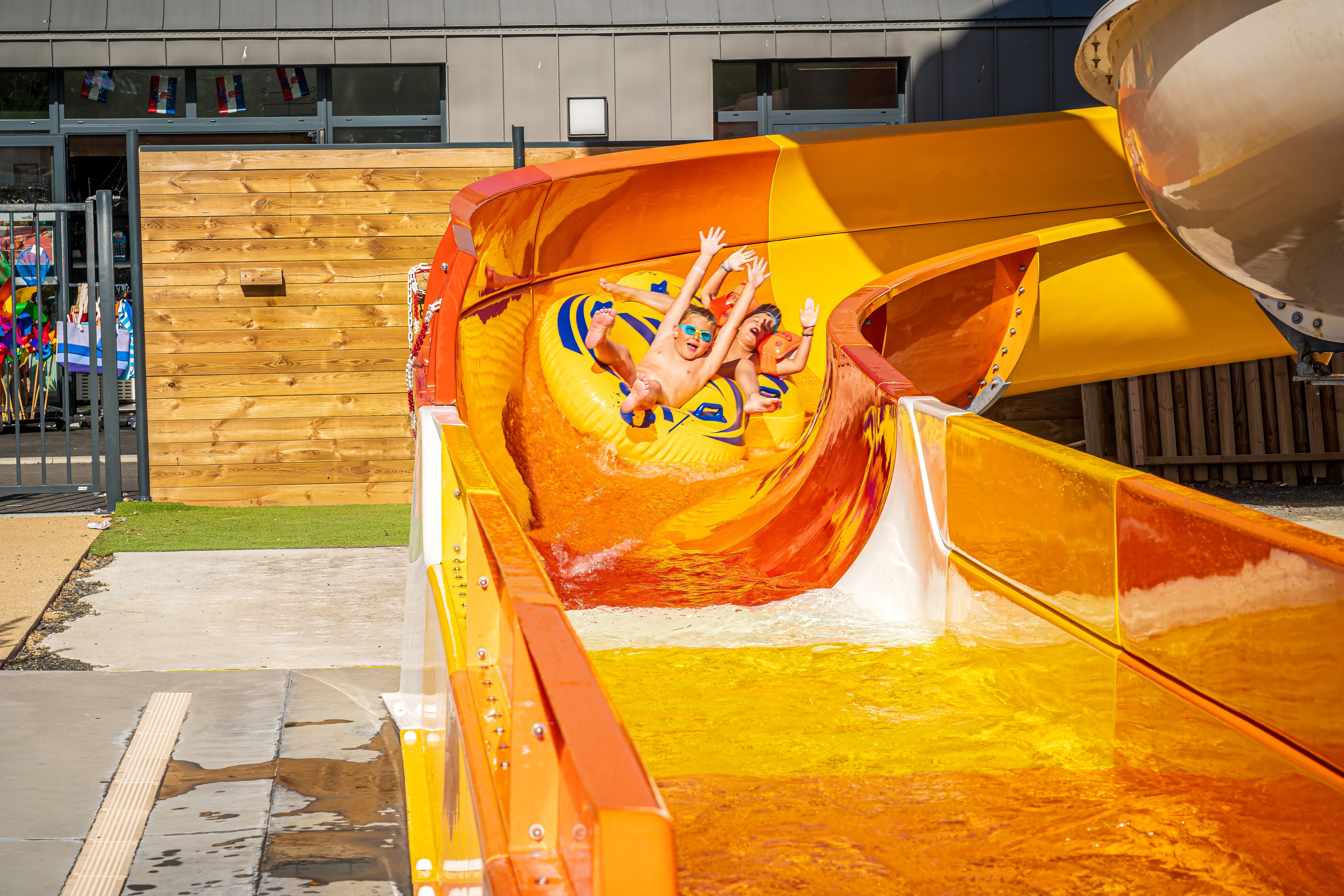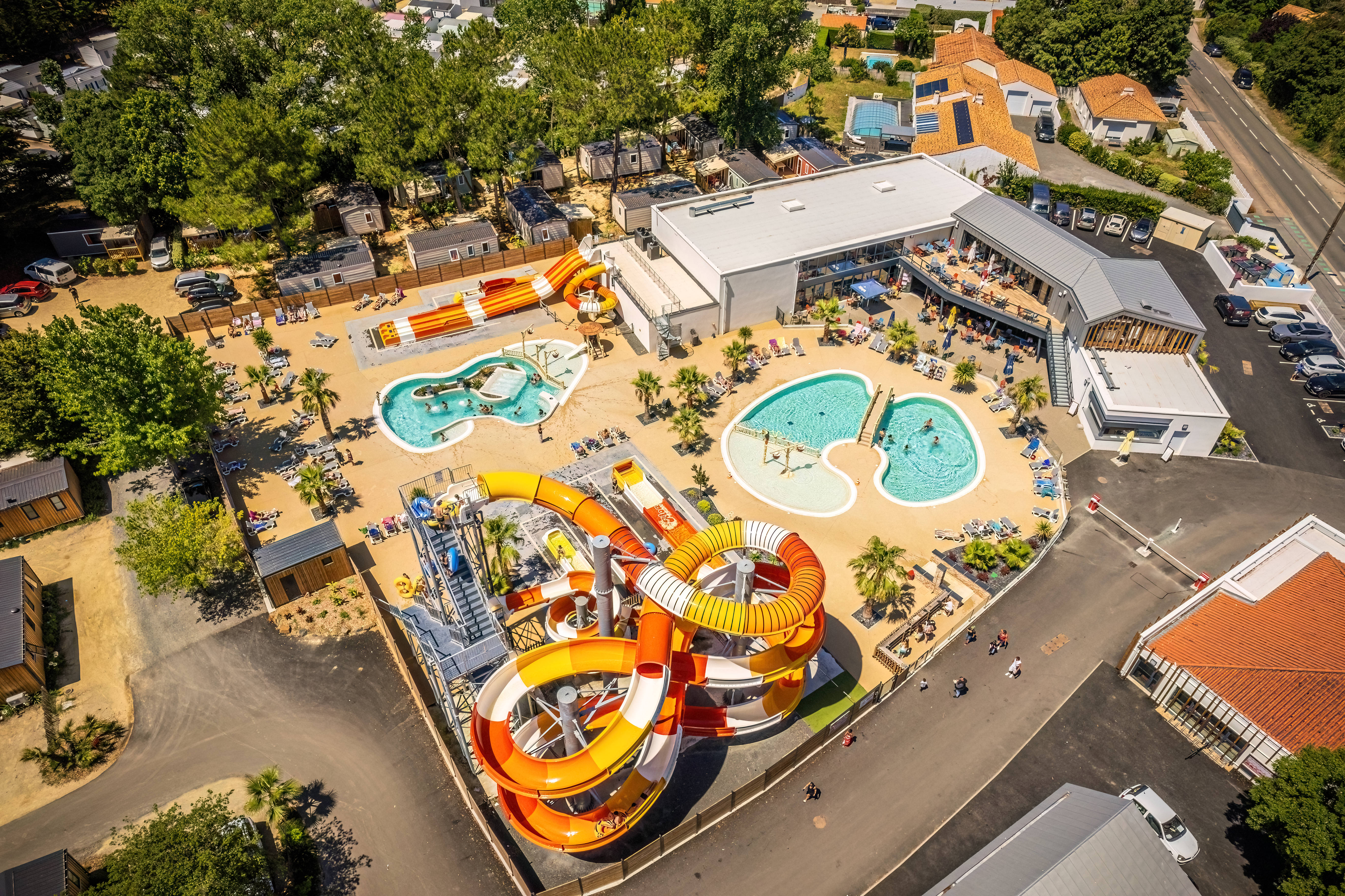 Espace aquatique extérieur : 1 espace avec piscine et pataugeoire et un espace avec 2 piscines, pataugeoire aqualudique, bain à remous (réservé aux adultes), 7 pistes de toboggans dont 1 bouées
